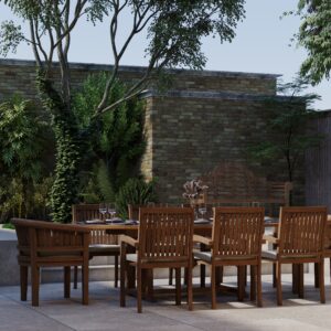 This magnificent garden dining set is made of high-quality teak wood and comprises of an extending oval table measuring 180cm to 240cm in length. In addition to the table, the set includes 6 sturdy teak stacking chairs, 2 solid San Francisco chairs, and comfortable cushions for each seat. The table features an innovative double-leaf mechanism that allows you to adjust it to 3 different sizes, with the smallest size still providing access to the parasol hole. The table also boasts a 4cm thick table top for exceptional durability. Enjoy dining and entertaining outdoors in style and comfort with this elegant teak garden dining set.