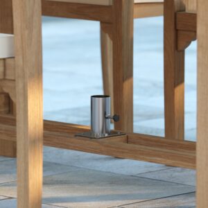 The 6 teak Henley stacking chairs, with their smart vertical slat, present an incredible advantage due to their storage capacity, as they can be neatly put away when not needed. On the other hand, the San Francisco chairs provide a comfortable and laid-back seating experience that is equally supported by their robust built. Both styles of chair complement each other nicely.