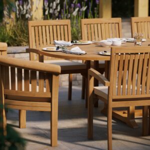 The table features an innovative double-leaf mechanism that allows you to adjust it to 3 different sizes, with the smallest size still providing access to the parasol hole. With this elegant teak garden dining set, you can enjoy dining and entertaining outdoors in both style and comfort.