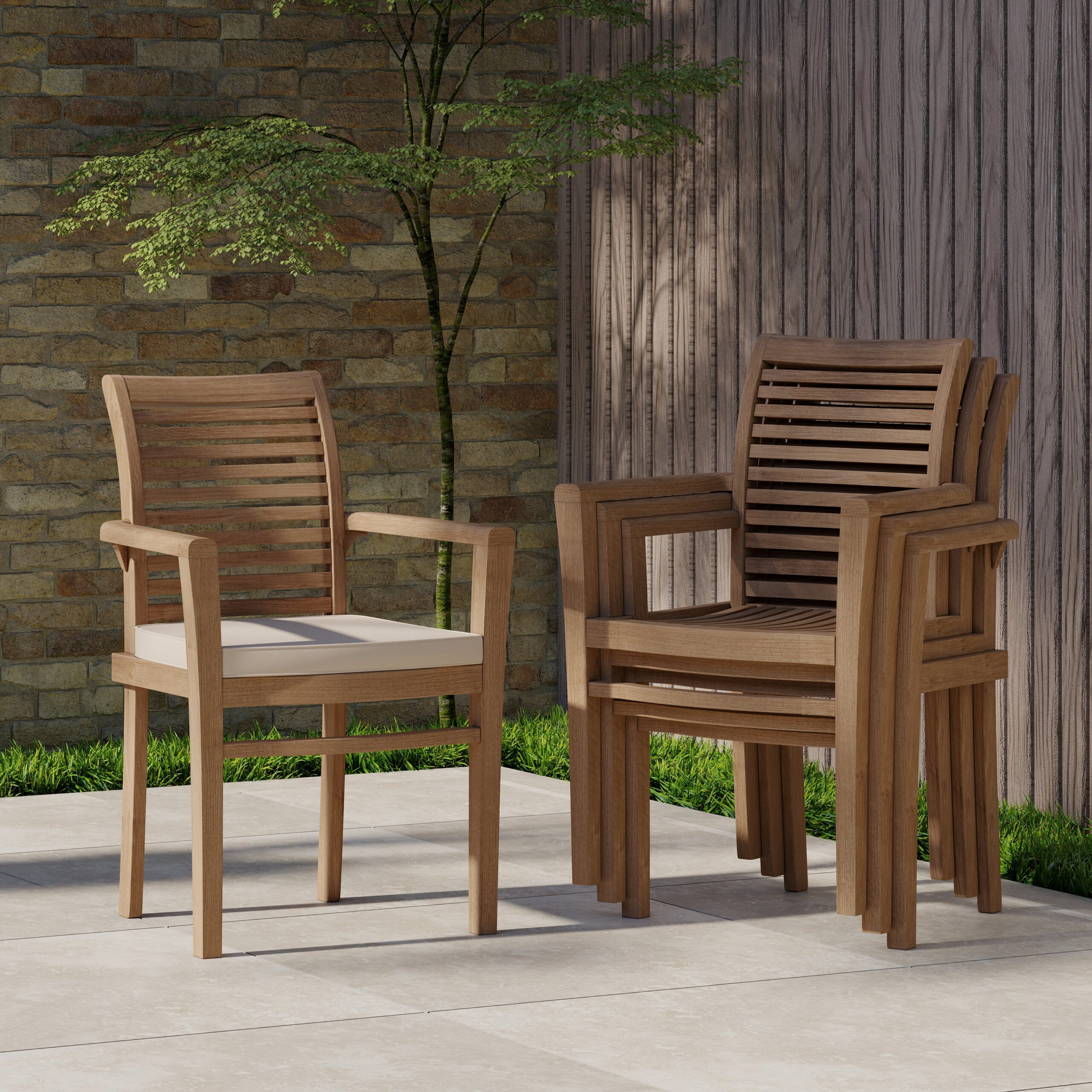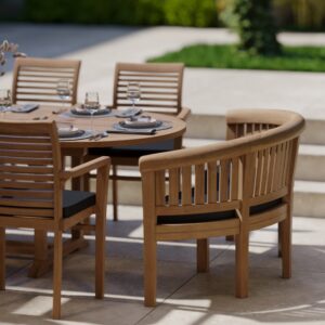 The six teak Oxford stacking chairs have an attractive horizontal slat design, adding a touch of elegance. Stacking chairs offer the incredible advantage of easy storage, as they can be neatly stacked when not in use. On the other hand, the San Francisco bench offers comfortable and relaxed seating for up to three people, supported by its robust construction. Both seating options complement each other well.