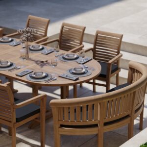 This magnificent teak garden dining set is crafted from high-quality teak and consists of an oval table with a 40mm thick top, adjustable from 180 to 240cm in length. In addition to the table, the set includes six sturdy teak stacking chairs and a San Francisco bench at each end, comfortably seating up to 12 people! The set comes complete with comfortable cushions for each seat. The table features an innovative two-leaf mechanism that allows you to adjust it to three different sizes, with the smallest size still providing access to the parasol hole. Enjoy dining and entertaining outdoors in style and comfort with this elegant teak garden dining set.